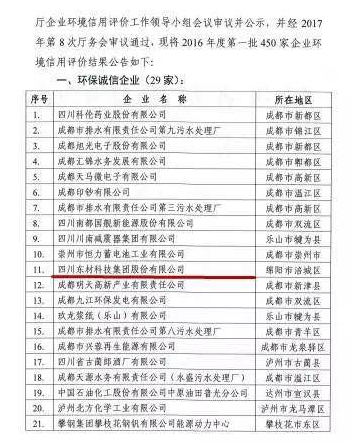 7月21日,四川省環(huán)境保護(hù)廳發(fā)布2017年第1號(hào)公告,公布了2016年度第一批企業(yè)環(huán)境信用評(píng)價(jià)結(jié)果。在全省申報(bào)的851家企業(yè)中,包括四川東材科技集團(tuán)股份有限公司在內(nèi)的29家企業(yè)獲得四川省2016年度“環(huán)境誠(chéng)信企業(yè)”稱號(hào)。
