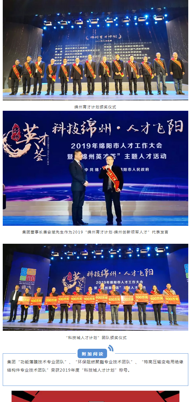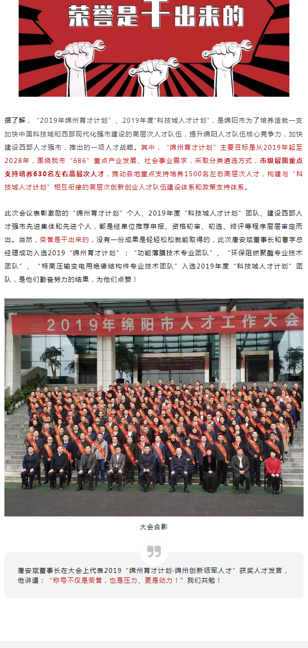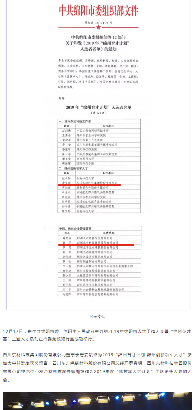 12月10日,綿陽市市委組織部等12部門聯(lián)合發(fā)布《關(guān)于印發(fā)2019年“綿州育才計(jì)劃”入選者名單的通知》(綿組通〔2019〕78號(hào)),公示了14類125名入選者名單,公司董事長(zhǎng)唐安斌成功入選2019“綿州育才計(jì)劃·綿州創(chuàng)新領(lǐng)軍人才”, 總經(jīng)理曹學(xué)成功入選2019年“綿州育才計(jì)劃·綿州企業(yè)管理菁英”。